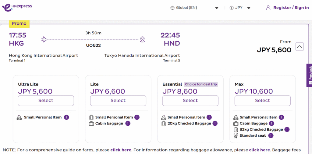 HK Expressは料金体系が4パターンあり明確でわかりやすく表示されています。